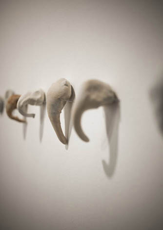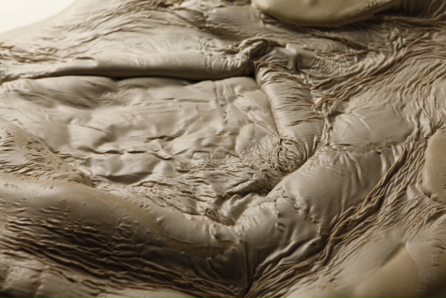 Qu’elle confronte, interroge, tout comme les rapports que nous entretenons avec elle. Puisant dans le registre de la représentation du corps organe, elle expérimente les transformations possibles des matières en les contraignant, par la cuisson ou les étirements. Entre la tension et la molesse, les propositions deviennent des sortes d’éléments à l’équilibre fragile où les zones sensibles se multiplent. Son travail devient support d’images, réceptacle de croyances ou de fantasmes. Dans ce sens, transformer le matériau devient important.